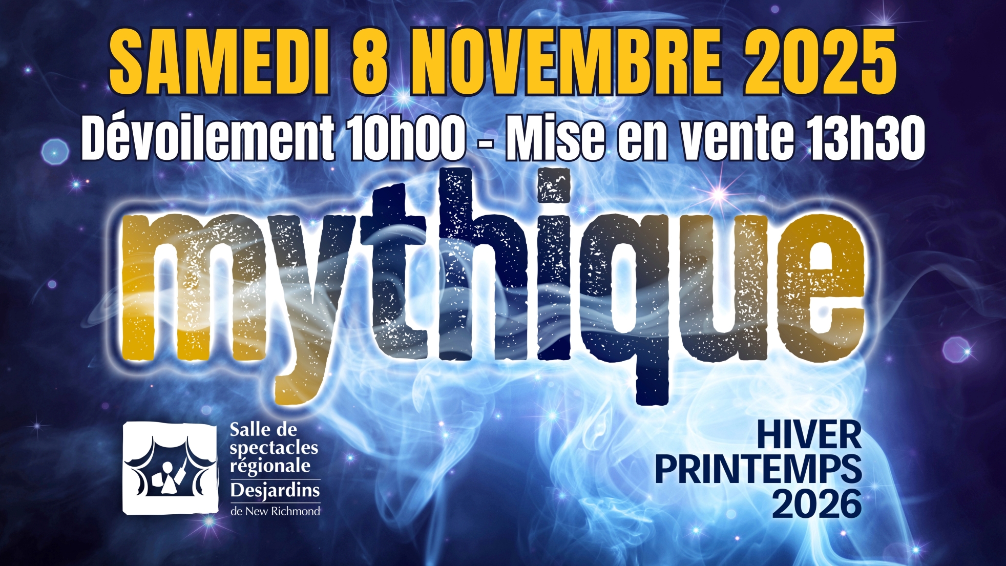La Salle de spectacles régionale Desjardins de New Richmond est heureuse de vous annoncer la date de lancement de sa prochaine programmation pour la saison HIVER-PRINTEMPS 2026 sous le thème mythique.